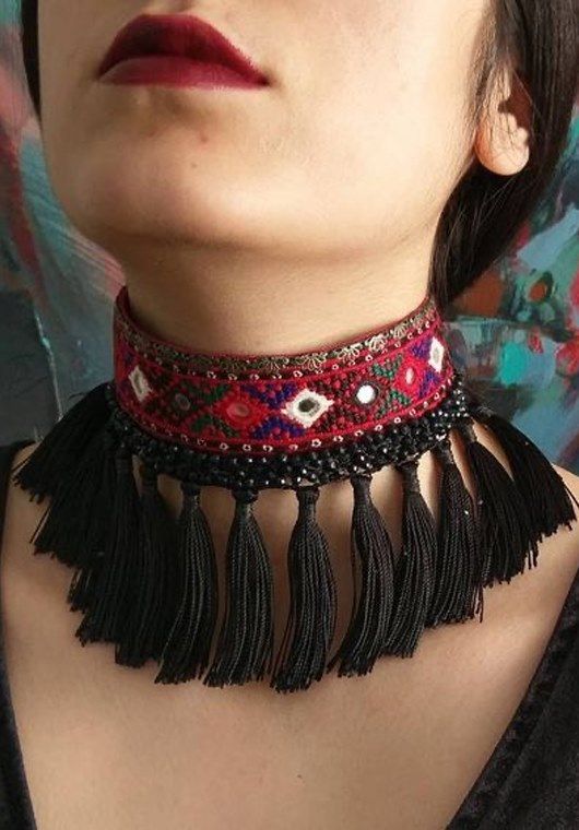 نوار خرج کار لمه و گلدوزی با آینه کاری روی زمینه مخمل مشکی
