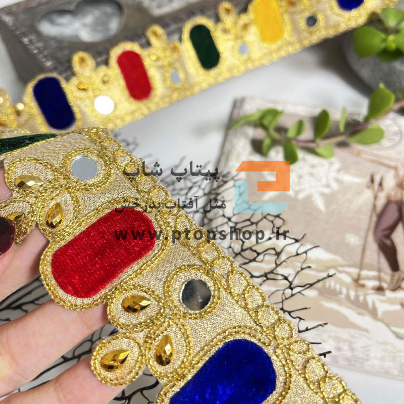 | جنس | نوار خرج کار لمه ، آینه و تیکه کاری مخمل با کریستال تراش خورده روی پارچه دیسکویی |