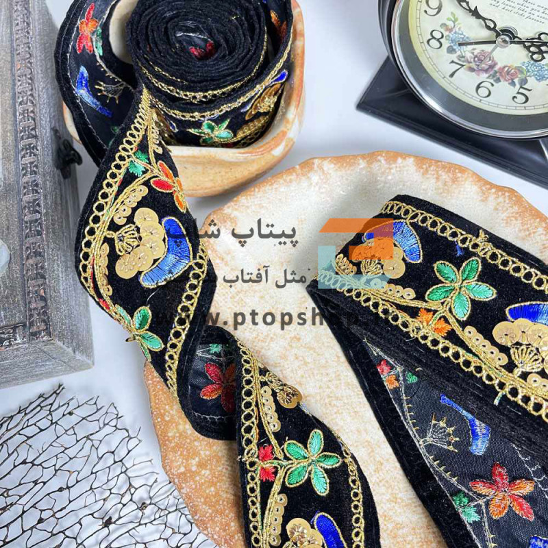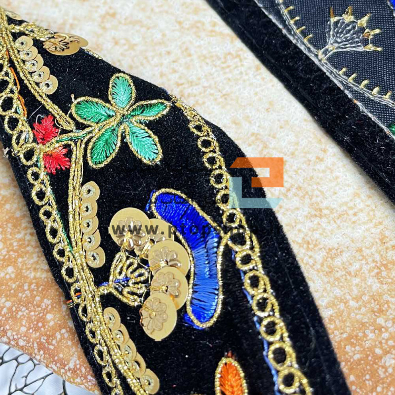 | جنس | نوار خرج کار لمه و گلدوزی با پولک کاری روی زمینه مخمل مشکی |