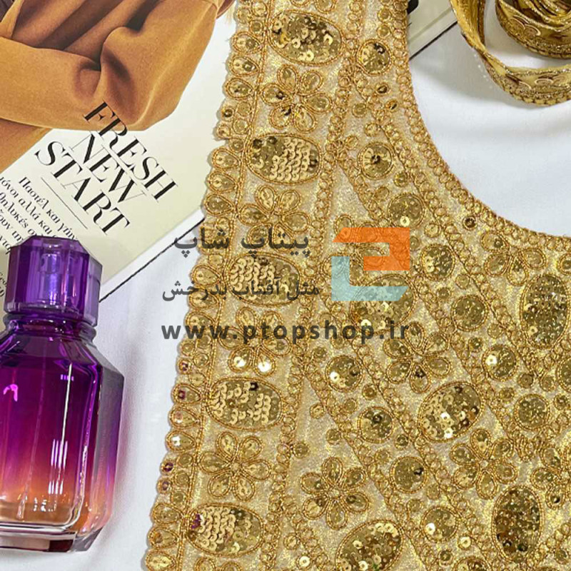 این پنل یقه از جنس پارچه دیسکویی لمه دوزی شده با پولک دوزی پر کار، زیبایی خیره کننده ای داشته و همین جلوه زیبا و درخشان را به هر کاری که روی آن بنشیند خواهد داد . درخشان بودن پنل بخاطر حجم بالای پولک بکار رفته در آن بقدری است که برای پارچه با بیس روشن نیز قابل استفاده است و همینطور روی پارچه های با طیف رنگی تیره این درخشان بودن چندین برابر خود را نمایش خواهد داد. این پنل یقه هم قابلیت دوخت و هم چسب کاری روی لباس را دارد. پنل تکی است و نوار موجود در عکس صرفا برای عکاسی با پنل ست شده است برای تهیه نوار از منوی نوار خرجکار سایت ptopshop دیدن فرمائید. ابعاد این پنل با قد 37 در عرض 30 سانتی متر می باشد.