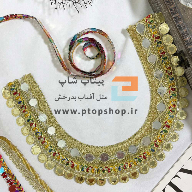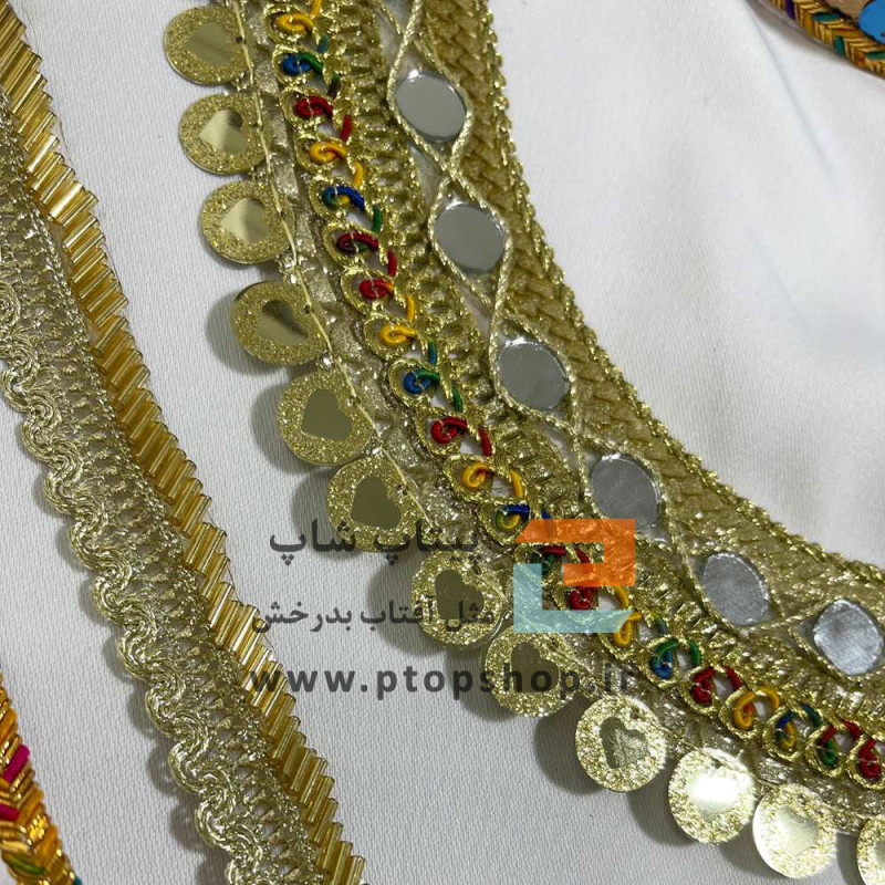 نوار خرج کار اتویی با پولک طلایی و کریستال رنگی و نوار قیطون هفت رنگ